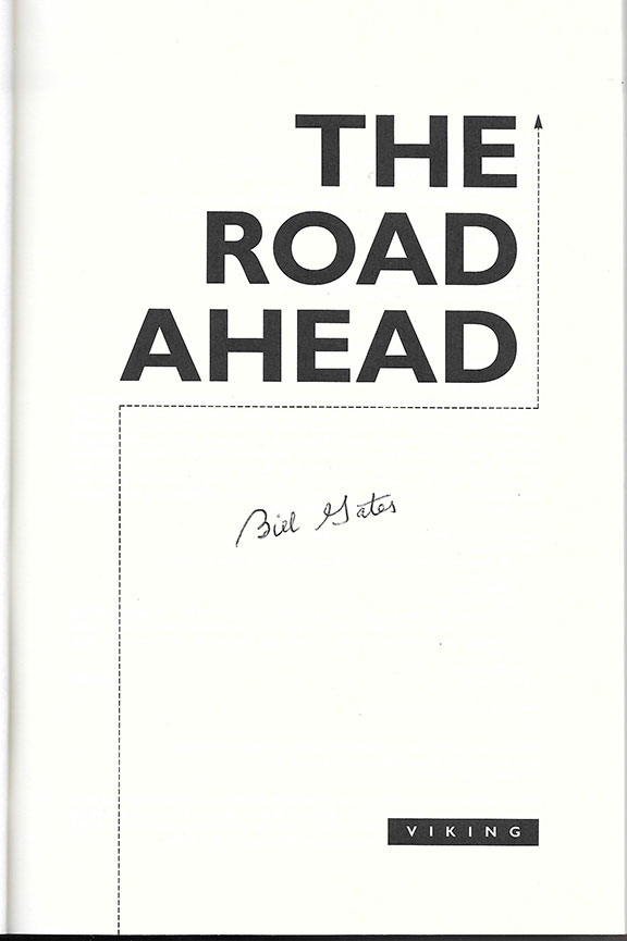 GATES, Bill (1955- ) American businessman, investor, computer programmer and co-founder of Microsoft. One of the wealthiest men in the world. His book: The Road Ahead” Viking Penguin Books, 1995, First Edition. Two hundred eighty-six pages, illustrated. Signed on the title page by Bill Gates. The scarce CD-ROM is still affixed in the rear of the book. In near mint condition with the dust jacket...............SOLD
