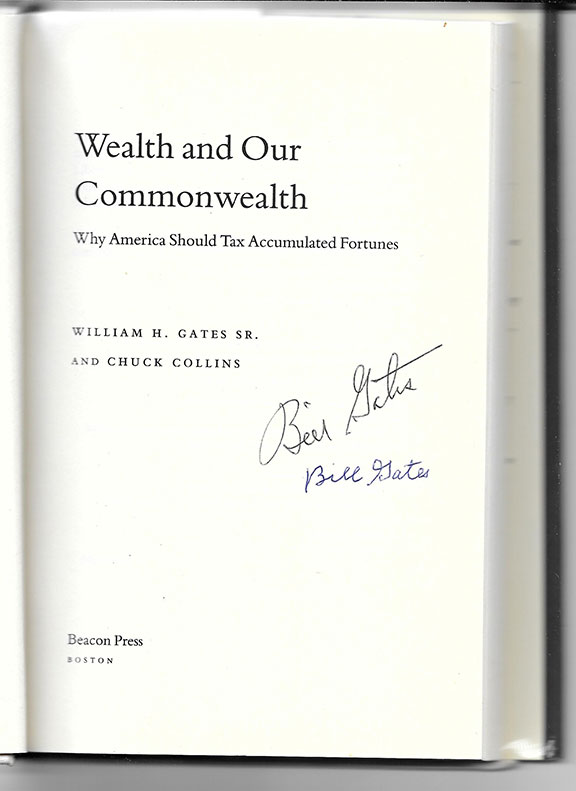 GATES, Sr., William H. (1925- ) American attorney, philanthropist and father of Microsoft co-founder Bill Gates. His book: “Wealth and Our Commonwealth, Why America Should Tax Accumulated Fortunes.” Beacon press, 2002, one hundred sixty-five pages. Signed by Bill Gates Sr. and Bill Gates Jr. on the title page. First copy of this book we have seen signed by both. A fine copy with dust jacket...............SOLD