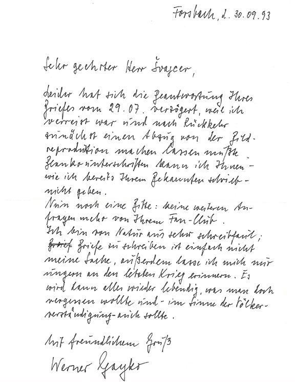 GAYKO, Werner German fighter pilot WWII. Ace credited with 14 victories. A.L.S., one very full page dated 30.09.93. Not translated.......$65.00