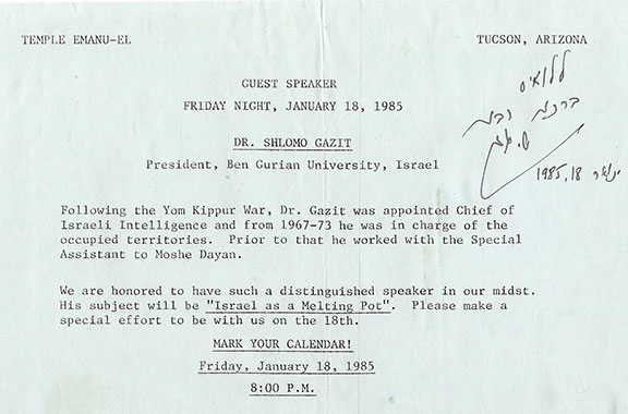 GAZIT, Shlomo (1926-2020) Israeli Military Officer. Major general in the Israeli Defense Forces. He headed Israeli’s Military Intelligence (1967-73). Played a role in the Peace Treaty with Egypt. He was in charge of the occupied territories and worked with the Special Assistant to Moshe Dayan. Flyer to be a Guest Speaker in 1985 at Temple Emanu-el in Tucson, Az. The subject will be “Israel as a Melting Pot”. Signed and dated by Gazit along with a sentiment. A scarce autograph. In fine condition......................$37.50
