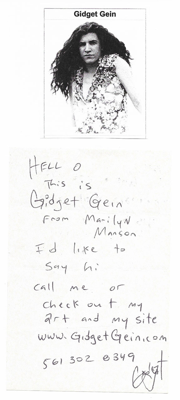 GEIN, Gidget (1969-2008) Birth name, Bradley Mark Stewart. American musician and artist. Co-Founder of the Rock Band Marilyn Manson. His stage name was taken from serial killer Ed Gein. Gidget died of a drug overdose when only 39 years old. Very scarce autograph letter signed, one page. “Hell O This is Gidget Gein from Marilyn Manson Id like to say Hi call me or check out my art and my site www.GidgetGein.com 561-302 8349 Gidget.” A very scarce letter incorporating his name three times and mentioning Marilyn Manson...............$150.00