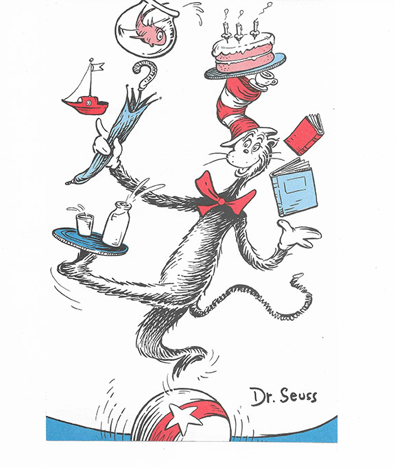 GEISEL, Theodore (Dr. Seuss) (1904-1992). Author, illustrator of children’s books. Creator of The Cat in the Hat. Color portrait of The Cat in the Hat juggling books, milk, umbrella, birthday cake and more. Measures 6”x9” and signed “Dr. Seuss.” In fine condition..............................SOLD |