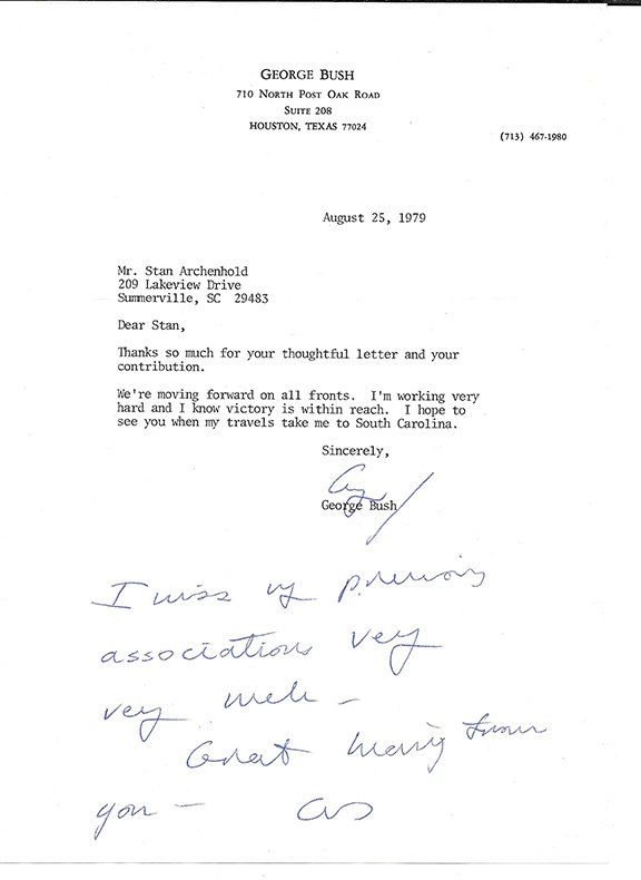 BUSH, George H.W. (1924- ) Vice-President, President of the United States. Typed letter signed on his name imprinted stationery, Houston, Tx. Aug. 25, 1979. To Stan Archenhold. Bush writes: “Thanks so much for your thoughtful letter and your contribution. We’re moving forward on all fronts. I’m working very hard and I know victory is within reach. I hope to see you when my travels take me to S. Carolina. Sincerely, George.” In a lengthy handwritten postscript Bush writes: “I miss my previous associations very very much-great hearing from you- GB.” A very eye appealing letter with wonderful content and signed twice. A fine example.... $595.00