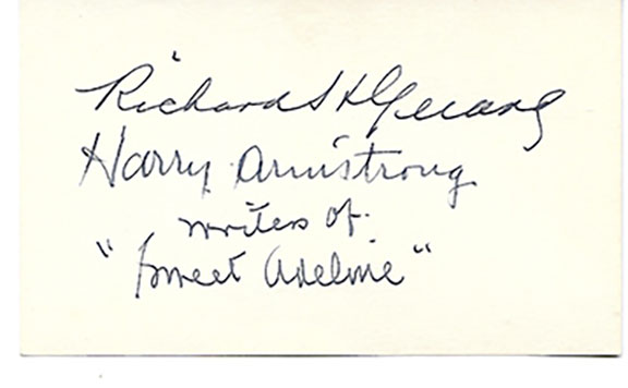 ARMSTRONG, Harry (1879-1951). American composer. Together they are noted for their ballad “Sweet Adeline” which has broken the hearts of many thru bar room quartets. The song was first published in 1903. Both have signed their names in ink on a 3”x5” card. Armstrong has added “writers of “Sweet Adeline”. In very fine condition and quite scarce to find the writer and composer on the same card............................$150.00