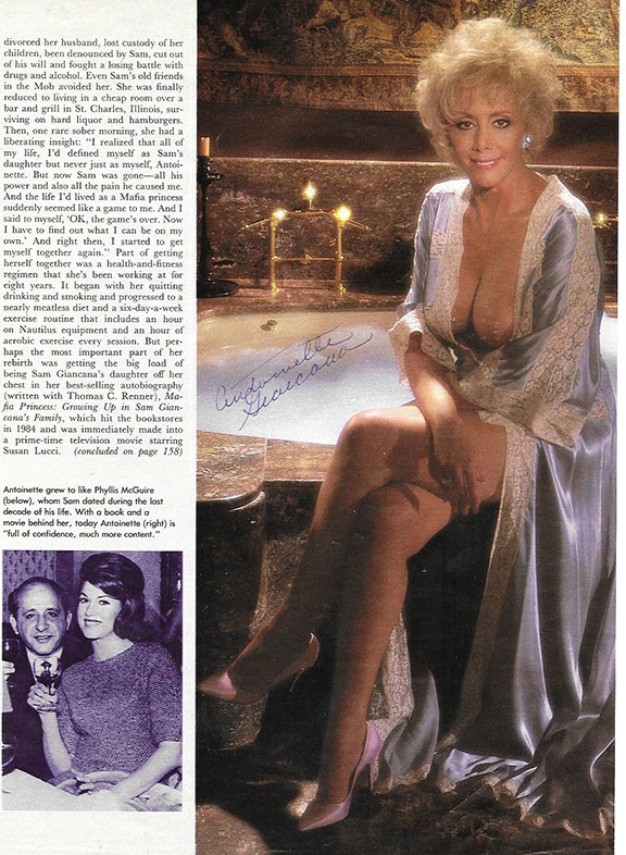 GIANCANA, Antoinette (1935- ) Actress, writer and daughter of slain mob boss Sam Giancana. Sam Giancana was one of the most powerful gangsters west of the Mississippi. Antoinette was married once which lasted only 4 months. At 52 years of age she had a 6-page spread in the February 1987 issue of Playboy Magazine. Known as “The Mafia Princess. “Very scarce color portrait, 5”X11” from Playboy Magazine, partially topless. signed: “Antoinette Giancana.” Topless signed photographs of “The Mafia Princess” are quite scarce..........95.00