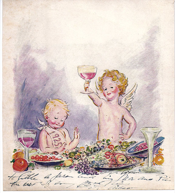 GIBSON, Charles Dana (1867-1944). Famous American illustrator, creator of The Gibson Girl. His Gibson Girls became a favorite in the U.S. and many other countries during the 1890’s and 1900’s. Color print from the New Years issue of Life Magazine (1925) of an angel making a toast to the 1925 New Years Baby. The top of the table is covered with fruits and drink. Lengthy two line inscription signed by Gibson. Although letters of Gibson appear in the market from time to time seldom does one find a signed print. This one is very attractive that would mat and frame well. $275.00