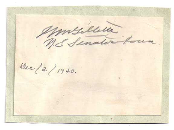GILLETTE, Guy Mark (1879-1975). United States Senator from Iowa. In 1945 he became President of the American League For Free Palestine. Uncommon pencil signature, adding in his hand: “U.S. Senator-Iowa”. Dated below by a different hand “Dec/2/1940”.  Affixed to a slightly larger page...........