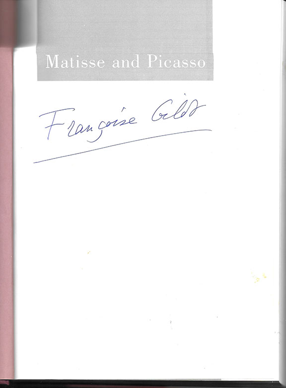 GILOT, Francoise (1921-2023). French painter, accomplished artist notable in watercolors. She is known for her romantic relationship with Picasso as well as her marriage to scientist Jonas Salk. This long time mistress had two children with Picasso and her painting of her daughter Paloma Picasso sold for 1.3 million dollars at Sotheby’s in London. In 1946 she moved in with Picasso and they spent 10 years together. After their breakup Picasso told art dealers not to purchase her art. He destroyed most of her possessions including her letters from Matisse. Her book Matisse and Picasso A friendship in Art. Doubleday, October 1990, First Edition, so stated. 340 pages, heavily illustrated, several in color. Measures 8”x10”. Together with a V/G dust jacket. Signed “Francoise Gilot”, .........$225.00
