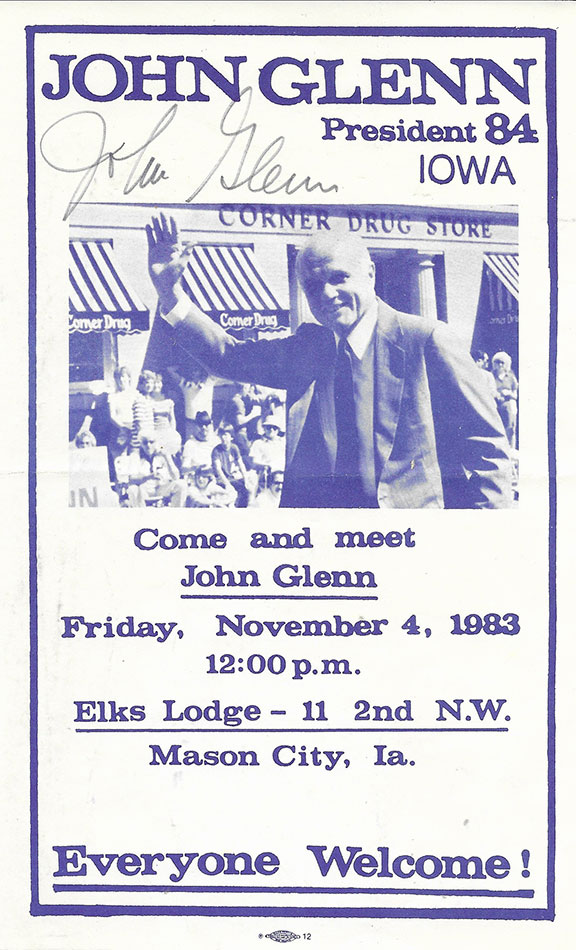 GLENN, John (1921-2016). One of NASA’s original seven astronauts and the first U.S. astronaut to orbit the earth on Feb.20, 1962. His flight on the Friendship 7 orbited the earth three times. Glenn was a U.S. Senator which lasted four terms. Very scarce campaign flyer “John Glenn President 84 IOWA”, 5.5”x8.5”, Come and Meet John Glenn, with a portrait of Glenn waving to the crowd. Hand signed “John Glenn.” First of this kind we have seen.......................$95.00 |