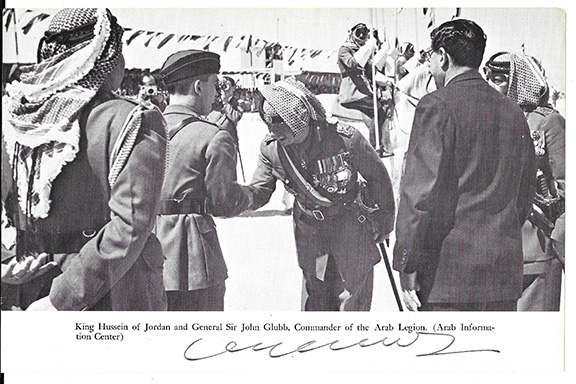 GLUBB, Sir John (1897-1986). British soldier who trained Transjordan’s 20,000 strong Arab Legion between 1939 and 1956. During 1956, Glubb was asked to leave Jordan by King Hussein. Magazine photograph , 6”x9”, B&W of Glubb shaking hands with King Hussein. Boldly signed by Sir. John Glubb. Very unusual in this format.......... $77.50![]() |