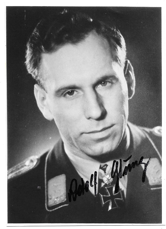 GLUNZ, Adolf (1916-2002). German fighter pilot during WWII. Flew with JG-52 and JG7-26. Ace credited with 71 victories. Awarded the Knight’s Cross of the Iron Cross. Photograph, B&W, 4”x6”, head & shoulders pose in uniform. Boldly signed with his full signature. Not common in signed photograph............... $95.00 |