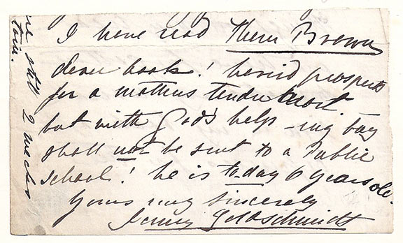 GOLDSCHMIDT, Jenny Lind (1820-1887). Swedish operatic soprano. Known as the Swedish Nightingale. Concluding portion of an autograph letter signed, several lines in part: “...but with God’s help my boy shall not be sent to a public school. He is today 6 years old. Yours very sincerely, Jenny Goldschmidt.”.....................................$175.00![]() |