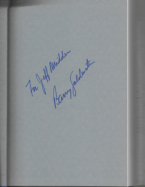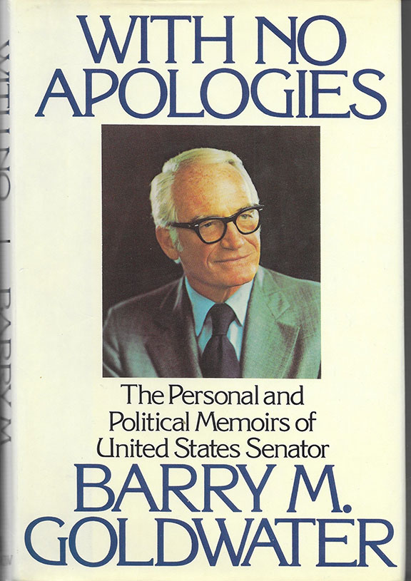 GOLDWATER, Barry (1909-1998). American politician, author, 5 term U.S. Senator. He was the nation’s leading conservative politician. Staunch supporter of Civil Rights. He ran for president against his close friend John F. Kennedy and again against Lyndon B. Johnson. His book: “With No Apologies, The Personal and Political Memoirs of United States Senator Barry M. Goldwater.” William Morrow and Co, 1979, First Edition, First Printing. Three hundred twenty pages, illustrated. Fine condition with dust jacket. Inscribed and signed on the front free endpaper: “For Jeff Midden Barry Goldwater.” Together with original mailing envelope with Goldwater’s mailing label..............$37.50