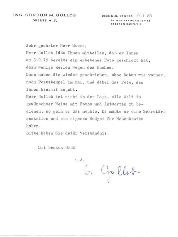 GOLLOB, Gordon (1912-1987) Austrian born Nazi German fighter pilot. Ace, credited with 150 victories. T.l.S. on his name imprinted letterhead. Dated 9.1.80. One page to a collector, not translated. Fine genuine ink signature as Gollob quite often used a rubber stamp signature to answer correspondence and to sign photographs. In fine condition.......................$135.00 |