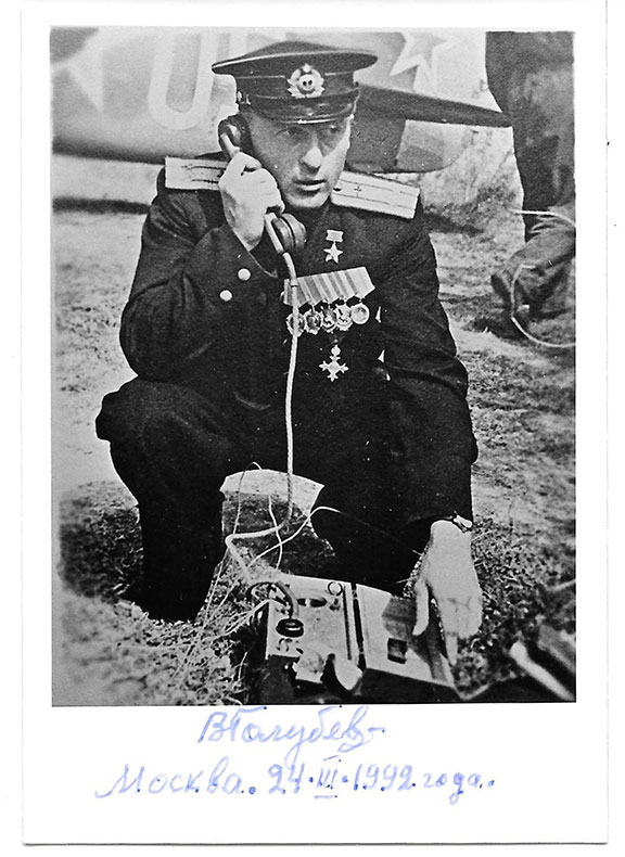 GOLUBEV, Vasily (1912- ). Fighter pilot, U.S.S.R. Ace with 38 victories. Russia’s 15th top scoring Ace. Attractive photograph of the Ace in uniform wearing his medals, B&W, 3.5”X5”, full length pose kneeling and talking on a phone. A plane is in the back ground. Signed and dated on the lower white margin. Uncommon and in fine condion...............$225.00![]() |