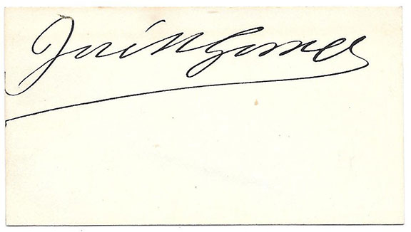 GOMEZ, Jose Miguel  (1858-1921).  Second President of Cuba. He took part in the ten years War (1868-1878) and the successful revolution began in 1895. He was a Cuban General known as “The Shark.”   Following a rebellion led by Gomez in 1909, the United States occupied Cuba.  Gomez’s administration was marred by corrupt practices. He was succeeded by Mario G. Menocal. Gomez went to New York City where he died. A very uncommon signature on a card................$225.00