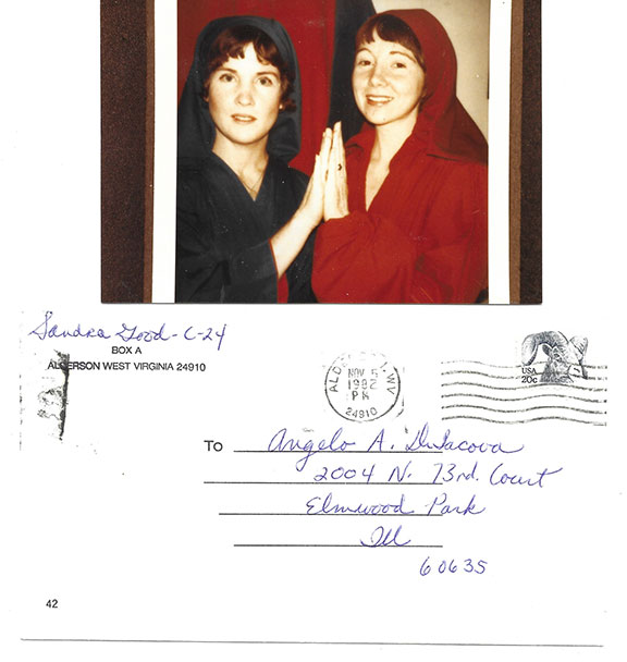 GOOD, Sandra (Blue) (1944- ). American criminal, member of the Manson family. Nickname “Blue” given to her by Charles Manson. In prison 1971-1985 for sending threatening letters to company executives. Envelope sent from Anderson prison, Nov 5,1982. Signed with her uncommon real name signature in the upper left corner; “Sandra Good - C-24.” Her more common way of signing her name was “Blue.” Together with a color photo of Fromme and Good..........$165.00