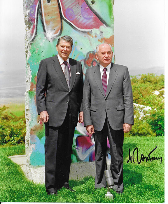 GORBACHEV, Mikhail (1931- ) Last leader of the Soviet Union. President of the Soviet Union (1990-1991). Awarded the Nobel Peace Prize (1990). Resigned in 1991. Fabulous, photograph of President Ronal Reagan standing alongside Mikhail Gorbachev. Behind them is a large section of the Berlin Wall. Very boldly signed by Mikhail Gorbachev with excellent contrast. This is an image rarely seen. It was on June 22, 1987 that President Reagan said to Gorbachev: “Tear Down This Wall.” A photograph, rich in history and in near MINT condition........SOLD