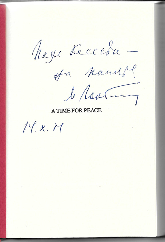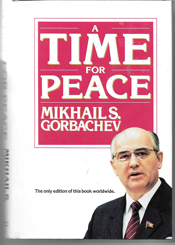 GORBACHEV, Mikhail S. (1931- ). Eighth and last leader of the Soviet Union 1985-1991. His book: “A Time For Peace” Richardson & Steirman, New York, 1985. Two hundred ninety-eight pages, illustrations in color. This is a collection of 38 of Gorbachev’s statements made between March and October 1985 since his election as General Secretary of the Communist Party Central Committee. He states: “May the 21st Century become the first century of life without fear of universal death.” In his introduction he states: “I sincerely wish my American readers prosperity and a peaceful future!” Just two years after the publication of this book, Ronald Reagan on June 12,1987 stated: “Mr. Gorbachev, Tear Down This Wall!”