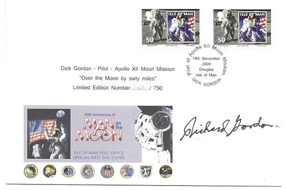 Fortieth Anniversary of Man on the Moon, Isle of Man Post Office, Official First Day Cover cachet, with two Isle of Man postage stamps cancelled 14th November 2009. Dick Gordon – Pilot Apollo XII Moon Mission. Over the Moon by sixty miles, Limited Edition Number 360/750. Hand signed by Richard Gordon. A scarce cover in very fine condition.................$135.00