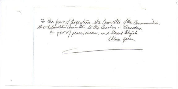 Very rare autograph quotation signed: “To the Jews of Argentina, the Committee of the Communities, the Education Committee, to the Teachers & Educators. A year of peace, success, and blessed Aliyah” Signed “Shlomo Goren”. Aliyah refers to the immigration of Jews to the land of Israel. Most likely sent as a response to a request from a teacher’s group....................$295.00
