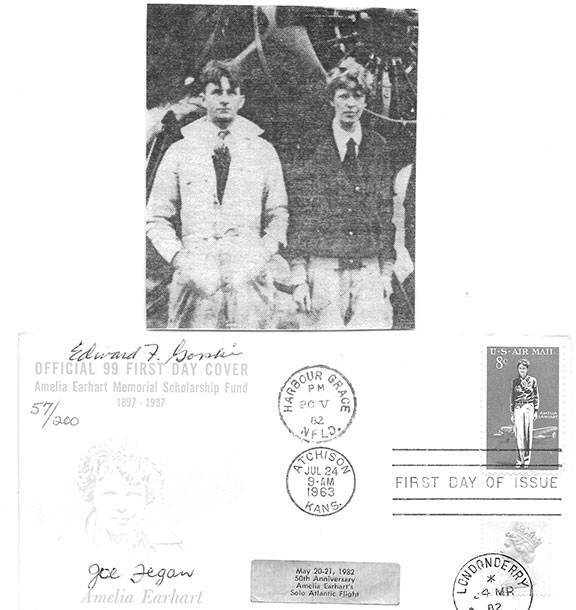 GORSKI, Edward (1907-1989). Mechanic who worked for Anthony Fokker. He supervised the assembly of the Fokker Friendship which Amelia Earhart flew across the Atlantic. He flew to Newfoundland with Earhart before she crossed the Atlantic. He helped prepare her Lockheed Vega for the 1st solo transatlantic flight by a woman. Cover with cachet of Amelia Earhart, First day of Issue cancellation of the U.S. 8 cent Amelia Earhart postage stamp. Postal cancellations from Harbour Grace, Newfoundland, Atchison, Kansas and Londonderry, Ireland.. Cover number 57 of 200 copies signed by Edward Gorski, her mechanic who was the last to see Earhart before her crossing the Atlantic and Joe Fegan who greeted her upon her arrival in Ireland. Fegan later became Mayor of Londonderry. In fine condition...........$95.00