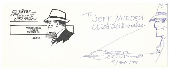 GOULD, Chester (1900–1985). American Cartoonist, Created and Wrote the Dick Tracy comic strip from 1931-1977. A fabulous signature, on a 3.5”x9” card featuring a profile sketch of Dick Tracy. Signed and inscribed, "To Jeff Midden with best wishes, Chester Gould 9/30/79." On the left side of the item is a printed full head portrait of Dick Tracy along with the name of his creator and mailing information... In mint condition with original envelope.......................$250.00![]() |