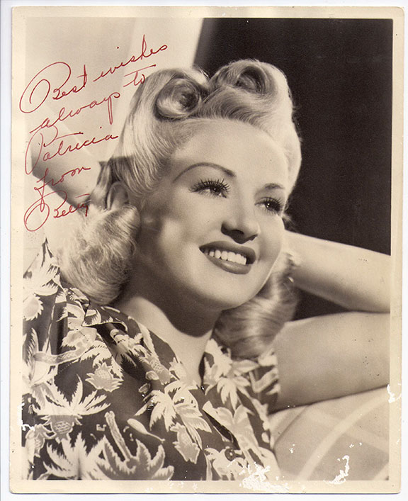 GRABLE, Betty (1916-1973) American actress, dancer and singer. Said to have the most beautiful legs in Hollywood. Died at the early age of 56. Vintage matte finish photograph, 8”x10”, head and shoulders pose, smiling. Inscribed and signed in red ink: “Best wishes always to Patricia from Betty”. Light wear to three spots bottom right otherwise very good.................$135.00![]() |