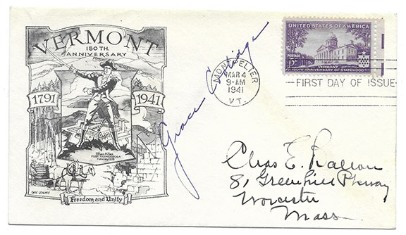 COOLIDGE, Grace (1879-1957) Wife of President Coolidge. First Lady of the United States (1923-1929) and second First Lady (1921-1923). First Day cover, 150th Anniversary of Vermont with the 3 cent Vermont Anniversary postage stamp affixed and a circular postal cancellation, Montpelier Mar 4 1941 VT. Hand addressed by a collector. Nice 3-inch signature “Grace Coolidge.” In fine condition.................$95.00 |