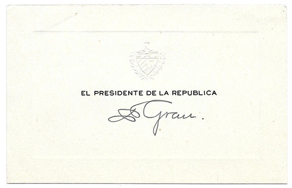 GRAU, Ramon (1887-1969). Cuban physician, professor of Medicine at the University of Havana. Appointed Provisional President of Cuba. Held that office from Sept. 10, 1933 until 15 January 1934. From the balcony of the Presidential Palace he took his Oath of Office in front of thousands of people however the government lasted only 100 days. He was a Cuban revolutionary leader who formed The Authentic Cuban Revolutionary Party in 1934. He was elected President of Cuba in 1944 and held that office until 1948. Very scarce official card of the presidency with the embossed Seal of Cuba. Imprinted: “El Presidente De La Republica.” Boldly signed “R. Grau.” A very rare signed card in excellent condition...........................$350.00