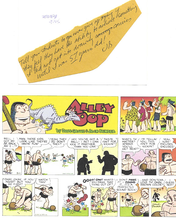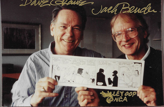 GRAUE, Dave (1926-2001) and BENDER, Jack (1931-2022). American comic strip artists. Noted for their popular comic strip “Alley Oop.” Graue died in a car accident. Wonderful color photo, measuring 4”X6” of the two holding up one of their comic strips. Both signed above their heads in gold ink. Affixed on the verso is part of an envelope where Bender writes words of encouragements. “Tell your students to never give up trying if they feel they have the ability to achieve something. I did not get into drawing comics until I was 57 years old. JB”. Together with a copy of a 2001 Alley Oop color comic strip..................................$85.00