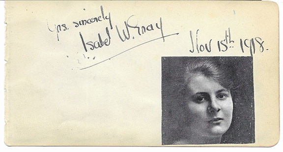 GRAY, Isabel W. (1851-1929). Australian prostitute, hotelier (Royal Mail Hotel) and storekeeper at Eulo, Australia. Located on the Paroo River. Eulo was a popular gathering place for travelers. She had a complaisant husband that enabled her to operate a successful courtesan. Her bedroom was stocked with liquor. She was given the name of “The Queen of Eulo.” In 1892, Isabel and her husband were charged with a variety of offenses, including disorderly conduct, assaulting the police, purchasing a sheep illegally, and passing a dishonored cheque. In response, she sued the police for assault, false imprisonment, and malicious prosecution. At 53 years old she married a 29-year-old Tasmanian. She became very wealthy wearing fine jewelry made of her favorite stone, opals. By 1926 she was living in poverty and later was admitted to a mental hospital. The Eulo Queen will live on as one of the characters of the southwest Queensland history. A very scarce two-word sentiment and signature (after all men were not asking her for an autograph) on an album page: “Yrs, sincerely Isabel W. Gray, Nov.15th 1918.” A collector has affixed a facial portrait of gray at the bottom right of the page...$55.00