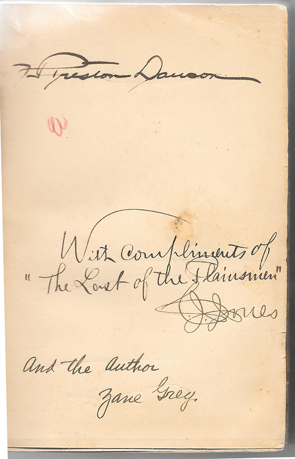 GREY, Zane (1872-1939). American author, best known for his popular adventure stories. His book: “The Last Of The Plainsmen”. The Outing Publishing Company, 1908, first edition, illustrated, three hundred-fourteen pages. Twenty-three B&W photos by the author and one additional B&W drawing. Gilt stamped, light green pictorial cloth. Fine ink sentiment by the subject of the book: “with compliments of The Last of the Plainsmen C.J. Jones”. Below is a sentiment signed by the author: “and the author Zane Grey”.