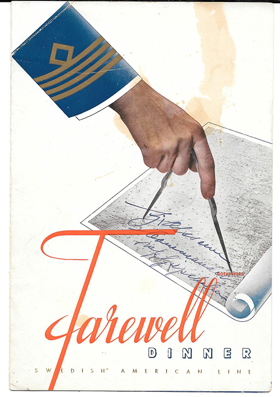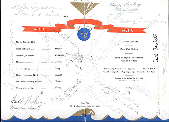GROMYKO, Andrei (1909-1989). Russian diplomat, in 1943 he became Russian Ambassador to the U.S. In 1946 he became Russian Delegate to the U.N. During 1952 he was Soviet Ambassador to great Britain. Deputy Foreign Minister from 1947-1956. President of the U.S.S.R. 1985-1988. First Class menu for the liner M.S. Gripsholm, July 24, 1948. This liner was owned by the Swedish American Line. Autographed on the cover by the captain. Inside the menu has been autographed by some of the Swedish passengers and also a few Russians. A. Gromyko has signed with a large 5” signature. Would look quite nice framed. In very good condition..................................... $650.00