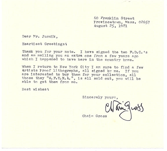 GROSS, Chaim (1904-1991). Austrian born American artist and sculptor. His works are on display in all major museums. Typed letter signed, one page, August 25, 1981. He writes in part: “Heartiest Greetings,..I have signed the two F.D.C.’s and am mailing you an extra one from a few years ago....When I return to New York City I am sure to find a few Artists Proof lithographs, all signed by me. If you are interested to buy them for your collection, all those ‘W.F.U.N.A.’,is all sold out…..” Boldly signed in full. In very fine condition................$75.00