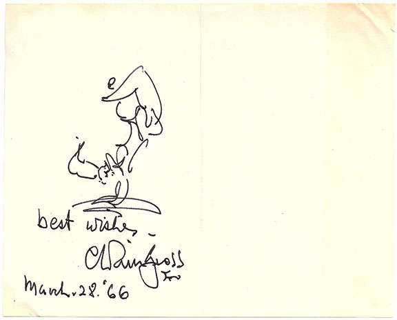 GROSS, Chaim (1904-1991). Austrian born American artist and sculptor. His works are on display in all major museums. Uncommon original sketch of two figures balancing themselves on one hand. Signed and dated along with a two word sentiment: “Best wishes, Chaim Gross, March 28’ 66”. In very fine condition and not common in original sketches. Would frame well...................... $195.00 |