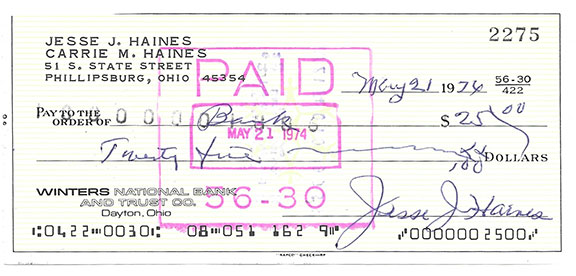 HAINES, Jesse J. (1893-1978) American professional baseball player, a pitcher who had a great fastball. Inducted into the Baseball Hall of Fame (1970). His personal check dated May 21, 1974, accomplished in his hand made payable to “Bank” for $25.00. Bank stamp touching the “J” in Jesse otherwise in fine condition...........$77.50 |