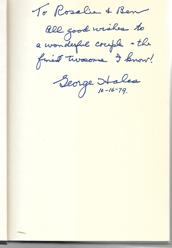 HALAS, George (1895-1983). Football pioneer. Charter enshrinee in the Football Hall of Fame. He was the MVP in 1919. One of the Founding Fathers of the NFL. He coached The Bears for 40 years with 8 NFL titles. His book: “Halas by Halas, The Autobiography of George Halas”. McGraw-Hill Book Company, 1979, First Edition. Inscribed, signed and dated: “To Rosalie & Ben, all good wishes to a wonderful couple-the finest twosome I know! George Halas, 10-16-79”. A very fine copy with the dust jacket protected in a clear mylar cover ............................$175.00