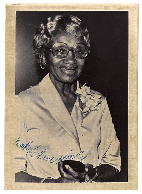 HALE, Mother Clara (1905-1992). Humanitarian, the Mother to those who needed one. Founded Hale House in Harlem a home for unwanted children and those who were born addicted to drugs. She eventually helped 1,000 drug addicted babies and children born with HIV. One of the great black women in history who helped in the equal rights movement. Clara Hale was recognized by Ronald Reagan in his 1985 State of the Union Address. Very scarce photograph, 5”x7”, half length pose, smiling, signed “Mother Clara Hale”. A choice specimen...............................$125.00