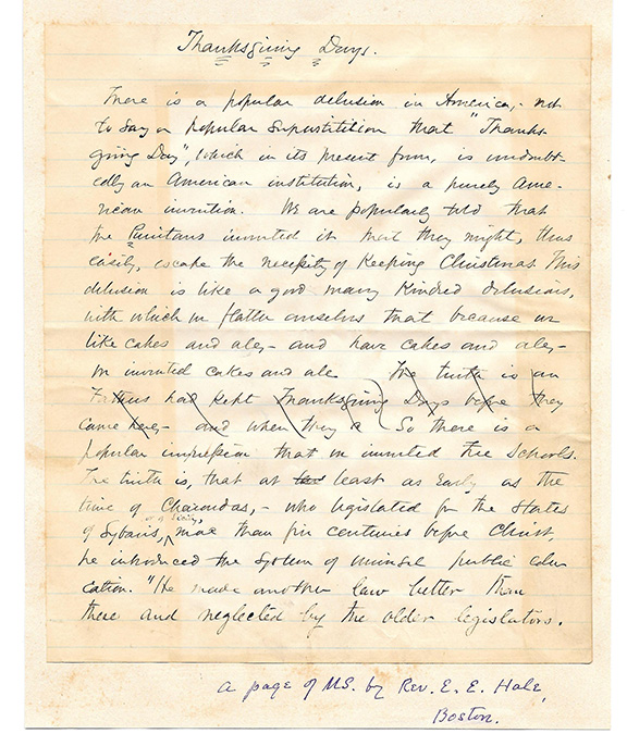 HALE, Edward Everett (1922-1909). Son of Nathan Hale, American Unitarian Clergyman and author. Best known for his short story “The man Without A Country”. Autograph manuscript, 1 page, 20 lines, unsigned. Neatly penned in Hale’s hand “Thanksgiving Days- There is a popular delusion in America, not to say a popular superstition that ‘Thanksgiving Day’, which in its present form, is undoubtedly an American Institution, is a purely American invention. We are popularly told that the Puritans invented it that they might, thus easily escape the necessity of keeping Christmas. This delusion is like a good many kindred delusions, with which we flatter ourselves that because we like cakes and ales-and have cakes and ales-we invented cakes and ales….for centuries before Christ, he introduced the system of universal public education…” Some corrections, two and one half lines crossed out but easily readable. Possibly a sermon to be read for Thanksgiving. According to a 1993 edition of Walter A. Benjamin Autographs, Inc. publication “The Collector’ a question was raised “What is the most valuable form of autograph?” The answer was “probably a writer’s or composer’s or poet’s originally heavily corrected working manuscript, normally unsigned.” A fine example tipped to a larger leaf. Perfect for framing................................ $395.00