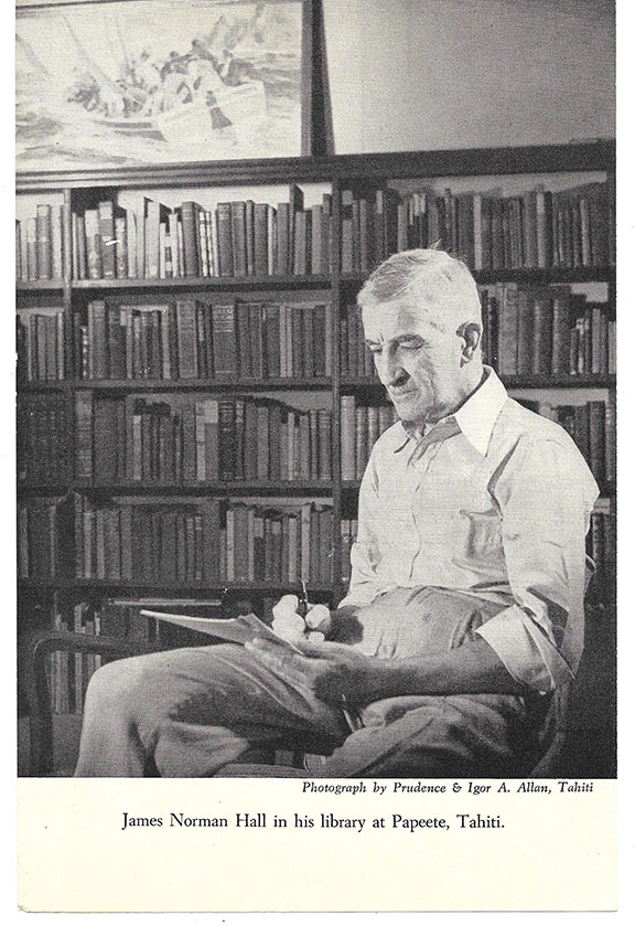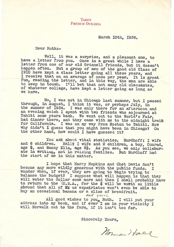 HALL, James Norman (1887-1951). American writer, famous WW1 Aviator. In 1917-18 flew with Eddie Rickenbacker in the 94th Pursuit Squadron, USAF. Some claim he had 6 victories in WW1, some other think only four. Near the end of the war he was a prisoner of war. His books include “Mutiny On The Bounty”, “Men Against The Sea”, and “Pitcairn Island.” Scarce typed letter signed, one very full page, Tahiti, March 10, 1936. To Ruth Sheldon, Norwalk, Conn. Greta content letter regarding a class letter from the old class of 1910 that he receives yearly. He goes on to list the information regarding Charles Nordoff and himself with regard to their marriage and number of children. The writer goes on to say: “I hope that Harry Hopkins and Chet Davis don’t become any more widely generous with the public funds. I wonder when, if ever, they are going to begin trying to balance the budget? I suppose what will happen is that they will water the dollar some more and then I shall probably have to return to the U.S.A. for the $ will be worth so little abroad that all of us expatriates won’t even be able to buy an occasional banana or a slice of breadfruit...” Boldly signed with two words added in his hand. Original envelope with the stamp removed. Portrait and newspaper article about the author. Very fine condition ad quite scarce...........................$295.00