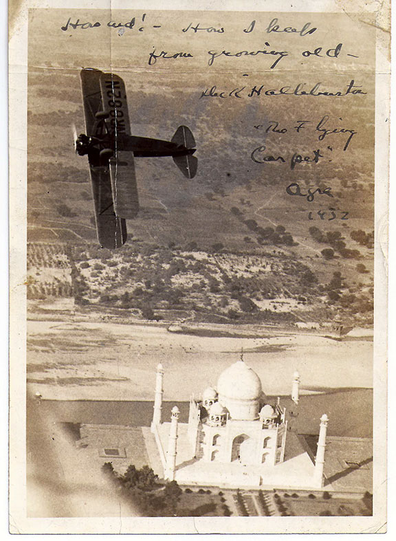 HALLIBURTON, Richard (1900-1939). Adventurer, travel writer, explorer. Known for swimming the Panama Canal, paying the lowest toll in the canal’s history, 36 cents. His Flying Carpet tour took 18 months circumnavigating the globe covered 33,600 miles visiting 34 countries. Some of his books “New World’s To Conquer” and “Richard Halliburton’s Book of Marvels” are fascinating reading. His last venture was attempting to cross the Pacific in a Chinese junk from Hong Kong to San Francisco. In bad weather, the ship apparently sunk and Halliburton was lost at sea. His empty grave has a stone marker in Memphis, Tennessee which reads “Richard Halliburton, Lost at Sea”. Very scarce photo from his world wide tour measures appx. 5”x7” of his plane “The Flying Carpet” in Agra, India above the Taj Mahal. Inscribed and signed: “Howard! - How I keep from growing old- Dick Halliburton, The Flying Carpet, Agra 1932”. One minor crease and light browning around the two top corners otherwise a good example of a scarce autograph..........................SOLD