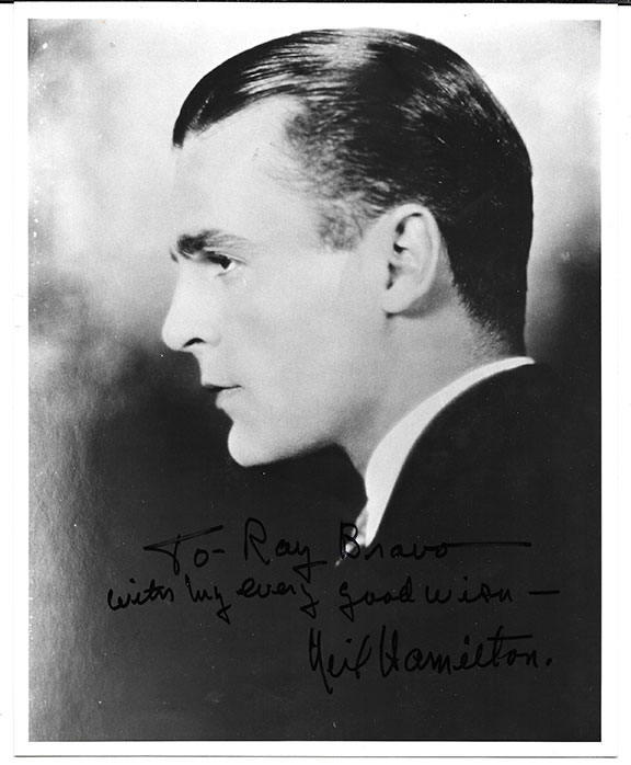 HAMILTON, Neil (1899-1984). Leading man during the 1920’s , became famous for his role as Commissioner Gordon on the Batman TV series during the 1950’s. Also well known for his role in “Tarzan The Ape Man” (1932). He also played the part of Harry Holt on “Expedition in Africa” in search of the elephant burial grounds that will provide enough ivory to make them rich. Photograph, 8”x10”, B&W, head and shoulders, profile pose. Inscribed: “To Ray Bravo-with my every good wish-Neil Hamilton.” In fine condition............................$110.00
