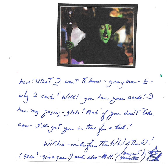 HAMILTON, Margaret (1902-1985). American actress who made her screen debut in 1933. She appeared in movies with W.C. Fields, Buster Keaton, Abbott and Costello, Mickey Rooney and more. Hamilton is best remembered for her part as the Wicked Witch of the West in “The Wizard of Oz.” On a 4”x6” card she writes: “how! What I want to know-young man- is - why 2 cards! Well!- you have your cards! I have my gazing-globe! And if you don’t take care -I’ll get you in there for a look! Witchie-wishes from the W W of the W!. (Go on! - Give a guess!) and also - M.H (Margaret Hamilton!)” She sketches a self-head and shoulders portrait as the witch, wearing her witches hat and holding a broom.” In excellent condition......................$775.00
