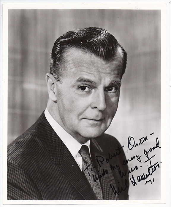 HAMILTON, Neil (1899-1984). One of the most popular leading men of the silent screen. Later known as Commissioner Gordon on the television series “Batman” during the 1960’s. Photograph, B&W, head & shoulders pose. Inscribed and signed: “To Robert Orth, with my every good wish, Neil Hamilton-71”. In fine condition................$95.00 |