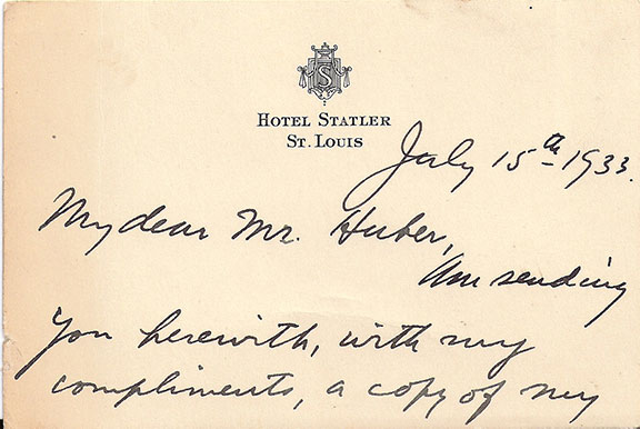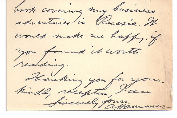HAMMER, Armand (1898-1990). German born American business leader. Art collector. Autograph letter signed, 2pg, on a Hotel Statler. St. Louis, correspondence card. Nice content mentions sending a copy of his book covering his business ventures in Russia. Not common in A.L.S. Light browning along right margin otherwise a V/G example............................ $195.00 |