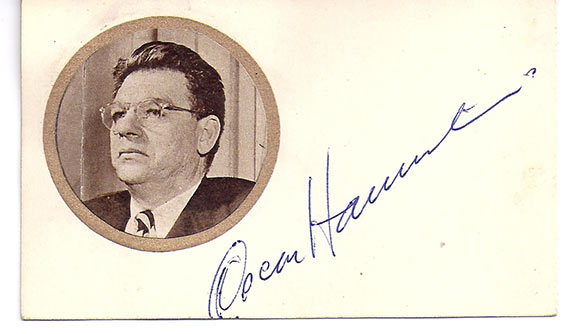 HAMMERSTEIN, Oscar (1895-1960). Composer, best remembered for “Oklahoma”, “Show Boat” and “Carousel”. Large bold, blue ink signature on a card. His small portrait affixed above his fine signature.....................................SOLD![]() |