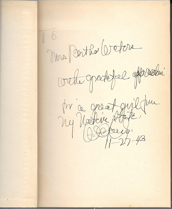 HANDY, W.C. (1873-1958). African-American musician, composer, best known for his “St. Louis Blues” (1914). Called “The Father of the Blues”. His book: “Father of the Blues, An Autobiography”. The Macmillan Co. New York, later printing, December 1942. Three hundred seventeen pages. Inscribed signed and dated on the front free endpaper: “To Mrs. Bertha Waters, with grateful appreciation for a great girl from my native state. W.C. Handy, 11-27-43”. a very good copy in a somewhat worn dust jacket protected by an archival mylar cover..................................$550.00