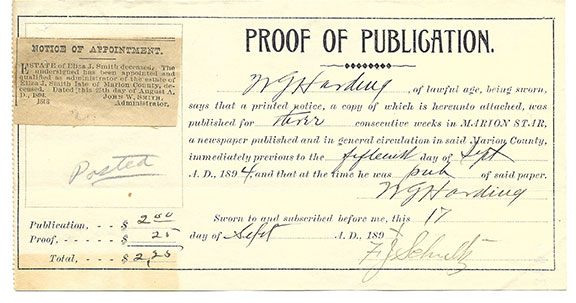 HARDING, Warren G. (1865-1923) 29TH President of the United States (1921-1923). After his death, a number of scandal’s were exposed including the Teapot Dome and an extramarital affair. Partly printed document signed twice as W.G. Harding. One page 7.75”x4” 15 Sept 1894. Proof of Publication, in full, W.G. Harding, of lawful age, being sworn, says that a printed notice, a copy of which is hereunto attached, was published for three consecutive weeks in Marion Star, a newspaper published and in general circulation in said Marion County, immediately previous to the fifteenth day of Sept. A.D., 1894, and that at the time he was pub of said paper. Countersigned 17 Sept 1894 by F.J Schulz. The referred notice is attached on the left border. Nice to see this document in full, many were cut in half to separate the two signatures of Harding. In fine condition.................$475.00