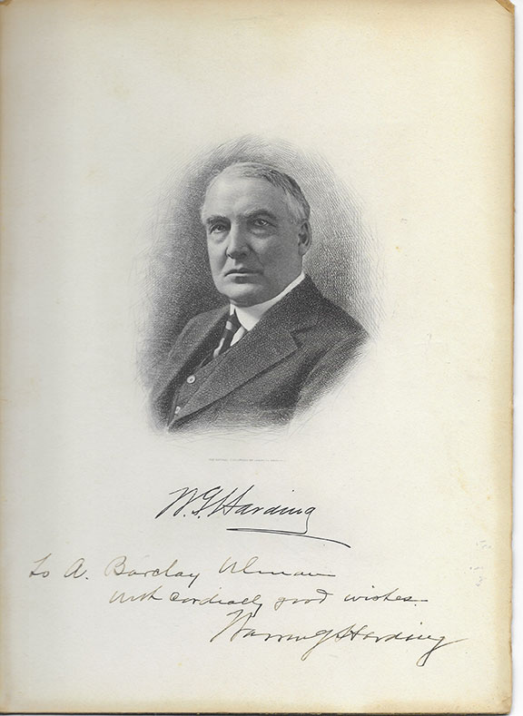 HARDING, Warren G. (1865-1923) Twenty-ninth President of the United States. Scarce 8”x11” engraved portrait on a heavy board, of President Harding, inscribed and signed in ink below the vignette: “To A. Barclay Ulman with cordially good wishes Warren G. Harding.” Two small nicks at top corners otherwise in V/G condition. Harding is infrequently found in this format.....................$475.00![]() |